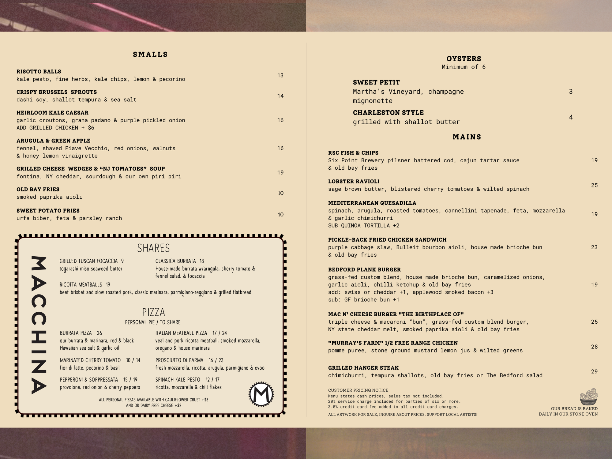 Macchina Pizza is available in either the Macchina Room, or the front dining room of The Bedford. Enjoy the warmth and charm of our dining rooms by making a reservation at The Bedford.